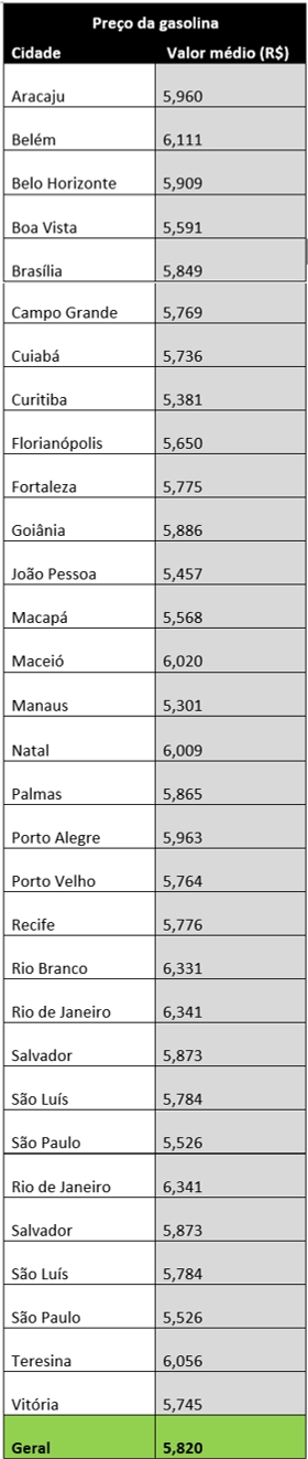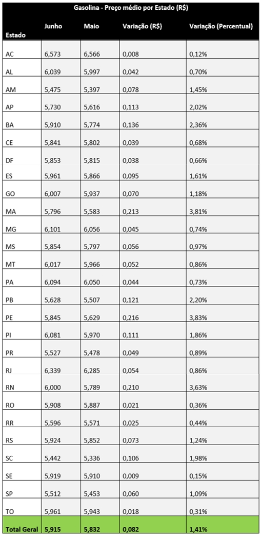 Alagoas ficou só na 20ª posição do ranking com uma variação de 0,70% de maio para junho, com preço médio da gasolina de R$ 6,039 em junho. Nenhum Estado registrou queda no preço do combustível.