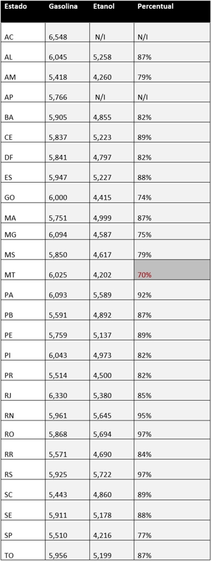 Rio Grande do Sul (R$ 5,722) e Rondônia (R$ 5,694) registraram os maiores preços médios do etanol em junho. Conforme o levantamento, a exemplo do que aconteceu em maio, apenas em Mato Grosso compensa abastecer o veículo com etanol – a opção só é vantajosa quando o litro do derivado da cana-de-açúcar custar 70% (ou menos) do que o litro da gasolina.