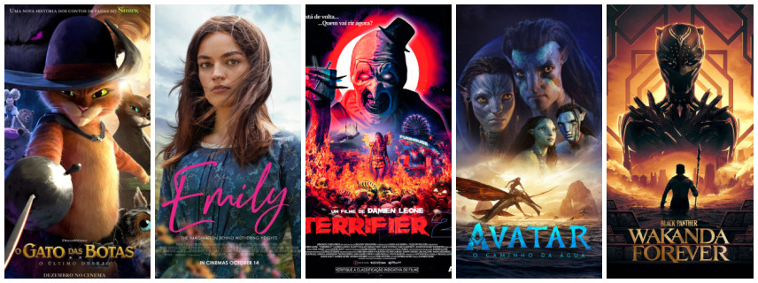 O público ainda pode assistir a ‘Terrifier 2’, nova produção de terror que fez o público desmaiar no exterior; ‘Avatar: O Caminho da Água’, a sequência da maior bilheteria da história dos cinemas; ‘Pantera Negra: Wakanda Forever’, da Marvel, que transcende o gênero de super-heróis e traz uma história madura com a difícil responsabilidade de viver o luto; Aftersun’; ‘Até Os Ossos’; ‘Ela Disse’; ‘Pinóquio’, de Guillermo del Toro; ‘Ruído Branco’; ‘Clarice Lispector: A Descoberta do Mundo’; ‘Sra. Harris Vai a Paris’; 'Paloma’; ‘Armageddon Time’; ‘Tudo em Todo o Lugar ao Mesmo Tempo’; ‘Serial Kelly’; ‘E.T. - O Extraterrestre’; ‘Marte Um’ e ‘Além da Lenda’.