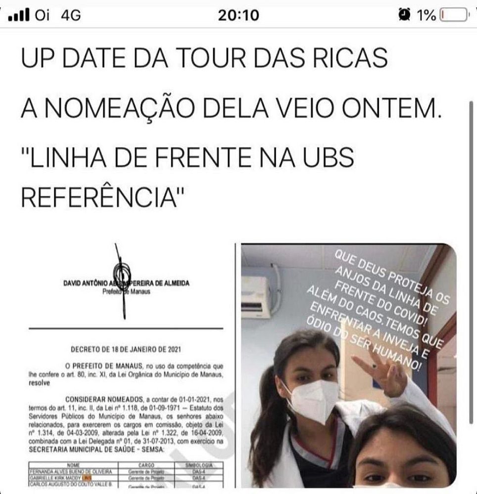 Logo após, circularam em grupos de WhatsApp de profissionais da Saúde imagens da vacinação das duas acompanhada da nomeação, no Diário Oficial de Manaus. A de Gabrielle no dia 18 de janeiro, um dia antes do início da vacinação, como gerente de projetos da Secretaria Municipal de Saúde. A irmã dela foi nomeada no dia 19 de janeiro.