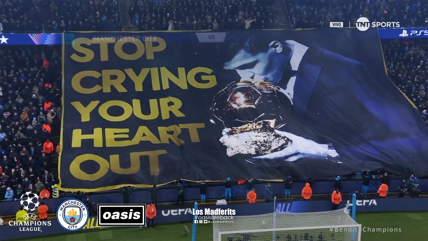 A bandeira tinha uma foto do meio-campista beijando o prêmio de melhor do mundo ao lado da frase "Stop crying your heart out" ("Pare de chorar com todo o seu coração", em livre tradução do inglês). A frase também intitula uma das principais músicas da banda inglesa Oasis.
