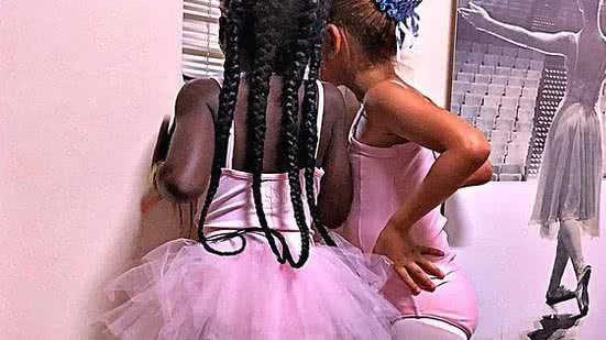A mãe coruja compartilhou uma imagem da pequena ao lado de uma amiga espiando pela janela da sala. Titi usa longas tranças nos cabelos, veste sapatilhas pretas e uma saia de tule cor de rosa.