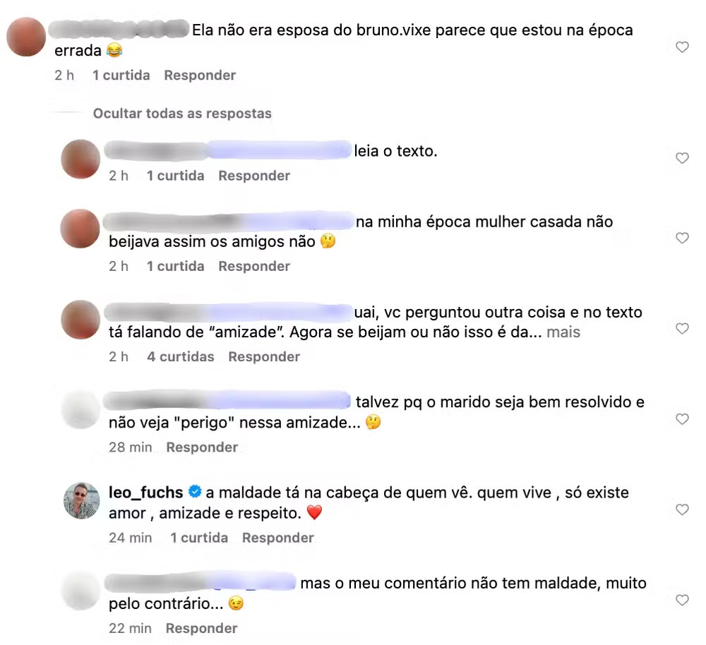 "Ela não era esposa do Bruno? Vixe, parece que estou na época errada", questionou seguidor. Outro indicou: "Leia o texto." Em resposta: "Na minha época, mulher casada não beijava assim os amigos não." Continuaram debatendo: "Uai, você perguntou outra coisa e no texto tá falando de amizade. Agora se beijam ou não, isso é da conta de quem é casado com ela. No caso, o Bruno." Leo respondeu diretamente: "A maldade tá na cabeça de quem vê. Quem vive, só existe amor, amizade e respeito."