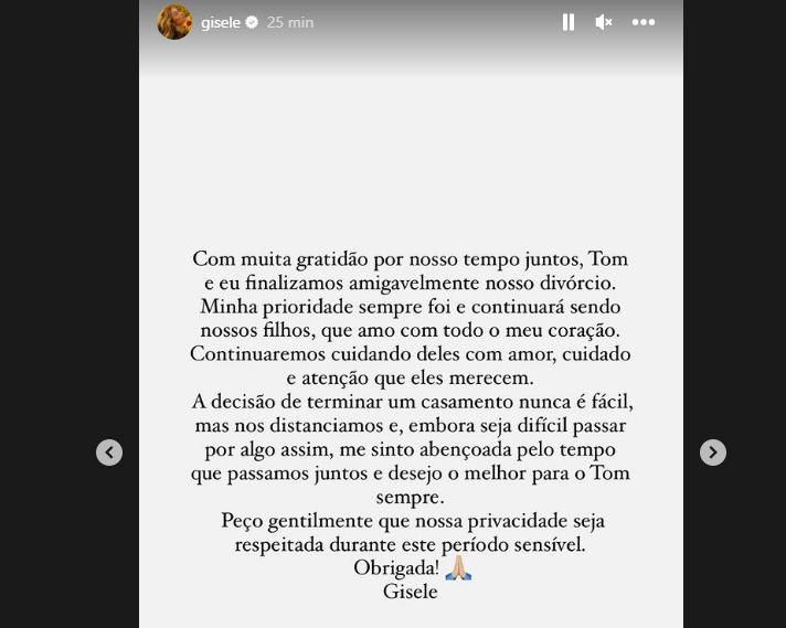 “Vamos continuar colaborando para dar a eles o amor, o carinho e a atenção que eles tanto merecem. A decisão de terminar um casamento nunca é fácil, mas nos distanciamos e, ao mesmo tempo em que obviamente é difícil passar por isso, me sinto abençoada pelo tempo que passamos juntos e sempre desejo apenas o melhor ao Tom. Peço gentilmente que nossa privacidade seja respeitada neste momento sensível”, completou Gisele na publicação. Confira: