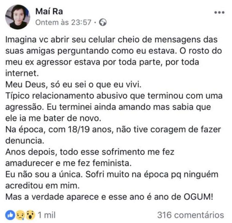 “Agressor de mulheres no BBB. Imagina você abrir seu celular cheio de mensagens de amigas perguntando como eu estava. O rosto do meu agressor estava por toda parte, por toda a internet. Meu Deus, só eu sei o que eu vivi. Típico relacionamento abusivo que terminou com uma agressão. Eu terminei ainda amando, mas sabia que ele ia me bater de novo. Na época, com 18/19 anos, não tive coragem de fazer a denúncia. Anos depois, todo esse sofrimento me fez amadurecer e me fez feminista”, afirmou Maíra Menezes.