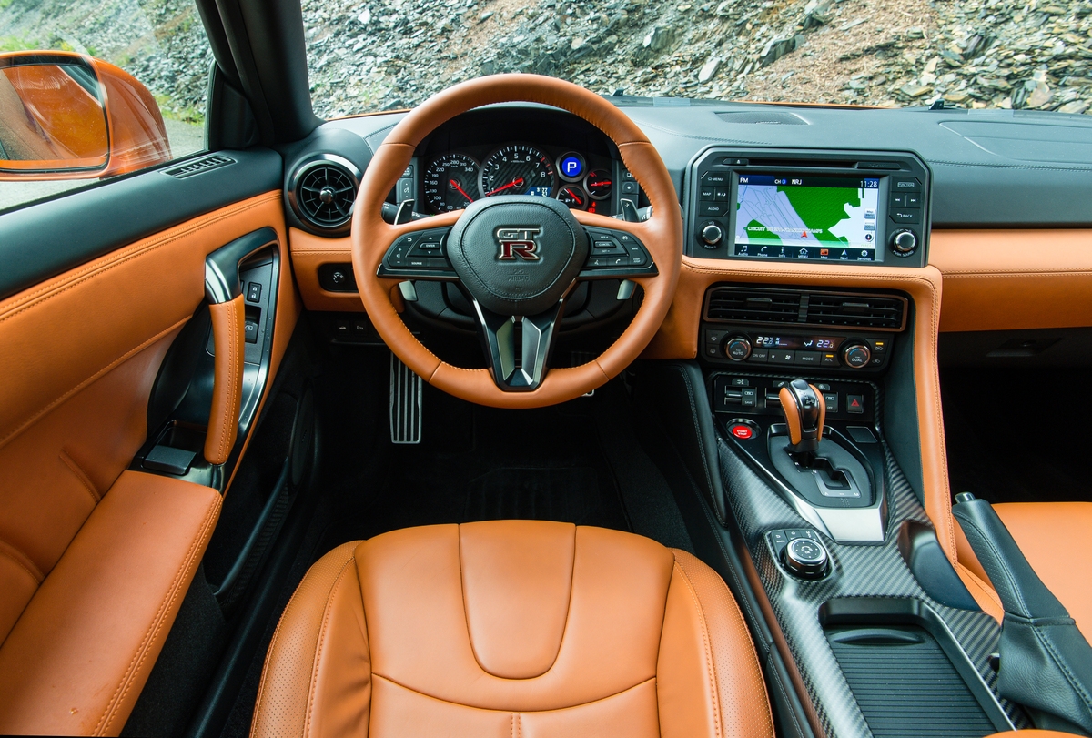 Por dentro, o Nissan GT-R proporciona um nível inigualável e jamais oferecido em termos de conforto, sofisticação e ergonomia nestes seus 50 anos de estrada. O ambiente forrado em couro e com detalhes em fibra de carbono possui um sistema multimídia com tela de 8 polegadas que vai além dos recursos convencionais.