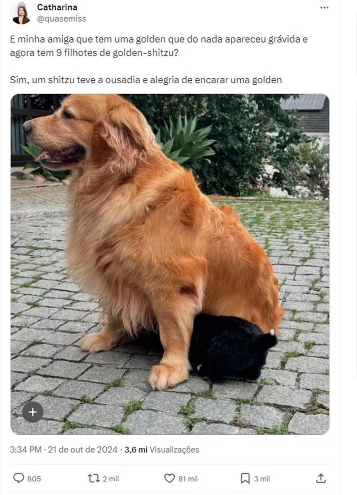 "Sim, um shih-tzu teve a ousadia e alegria de encarar uma golden", brincou. A publicação alcançou mais 3,5 milhões de visualizações na tarde de quarta-feira (23).