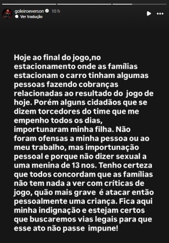 "Não foram ofensas a minha pessoa ou ao meu trabalho, mas importunação pessoal e, por que não dizer, sexual a uma menina de 13 anos. Tenho certeza que todos concordam que as famílias não têm nada a ver com críticas de jogo, quão mais grave é atacar então pessoalmente uma criança", publicou Éverson.