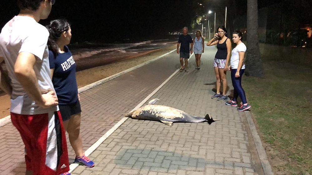 Banhistas que estavam no local carregaram o corpo do animal e o colocaram no calçadão, onde muitos curiosos se aglomeraram para observar.