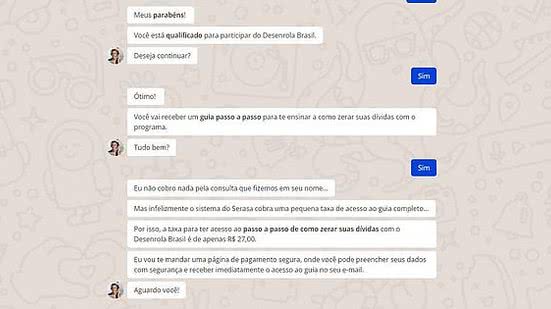 Um deles simula um chatbot de autoatendimento que faz perguntas e as responde com promessas enganosas sobre o programa de renegociação de dívidas -promete, por exemplo, descontos de 99%. Outro link vende um material chamado "Guia do nome limpo" por R$ 27. O pagamento pode ser feito via Pix ou cartão de crédito.