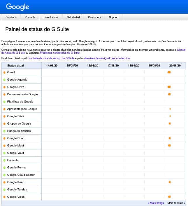 A principal reclamação dos usuários é em relação ao upload de arquivos nos serviços do Google, principalmente no envio de vídeos para YouTube e anexos no Gmail. Os problemas estão sendo monitorados pelo próprio Google no painel de controle G Suite.