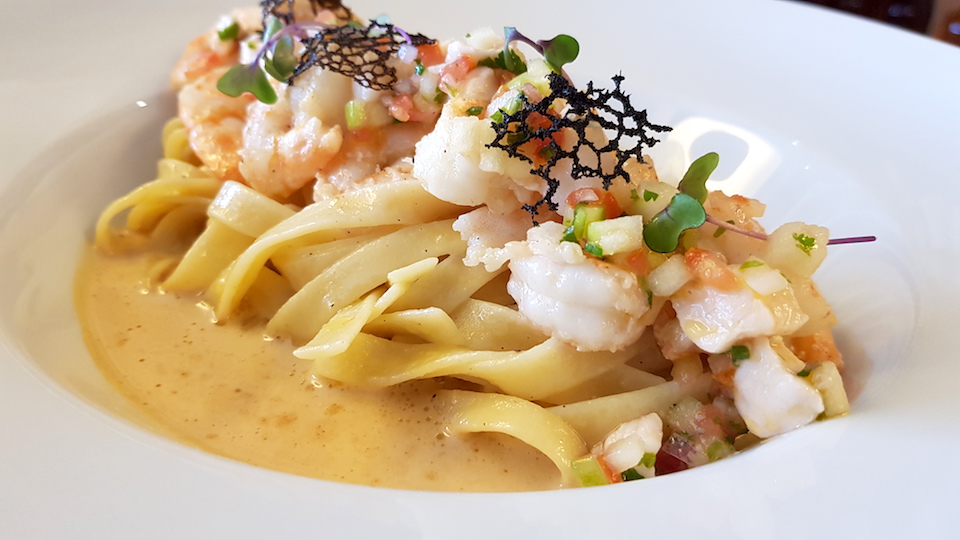 Camarões no vinagrete de maça e vieira no molho do próprio crustáceo com creme de leite fresco, um dos pratos do chef Thawã no Grand Cru