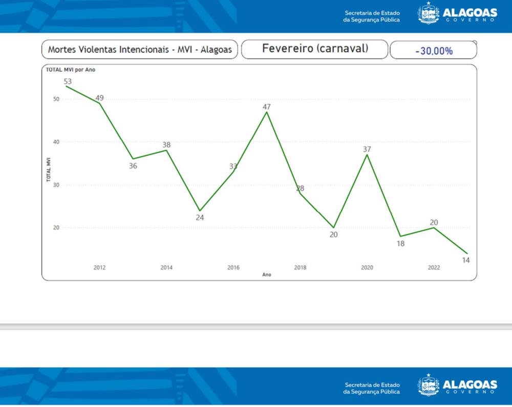 Ainda de acordo com dados divulgados pela SSP-AL, se comparado com o mesmo período em 2022, houve uma queda de 30% no registro de mortes violentas em Alagoas. Veja: