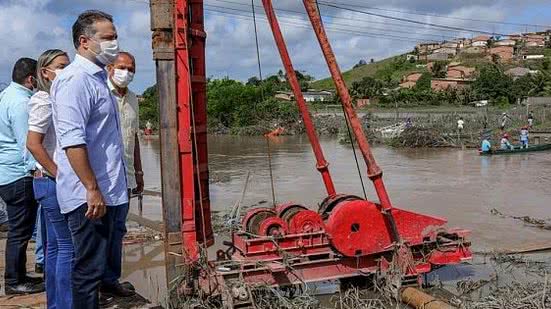 O governador Renan Filho visitou, nesta quinta-feira (18), municípios alagoanos localizados na região Norte do estado, afetados pelas fortes chuvas caídas nos últimos dias. Pela manhã, ele esteve em São Luís do Quitunde, onde verificou os danos provocados pelas enchentes. No município, Renan Filho inspecionou as obras de construção da Ponte do Quitunde, que está sendo erguida pelo Governo do Estado sobre o Rio Santo Antônio. O canteiro de obras foi afetado pela enchente. O governador, entretanto, estima que com a retomada dos serviços a obra seja concluída em 60 dias e o equipamento, entregue à população.