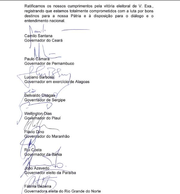 Os governadores, que não participaram de um encontro com Bolsonaro na semana passada e foram representados pelo governador Wellington Dias (PI), ratificaram cumprimentos pela vitória eleitoral de Bolsonaro registrando que estão "totalmente comprometidos com a luta por bons destinos para a nossa pátria e à disposição para o diálogo e o entendimento nacional", diz o documento.