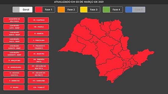 Atualmente, de acordo com atualização do plano estadual, divulgada na última sexta (26), seis regiões do estado estão na fase vermelha: Araraquara, Bauru, Barretos, Presidente Prudente, Ribeirão Preto e Marília.
