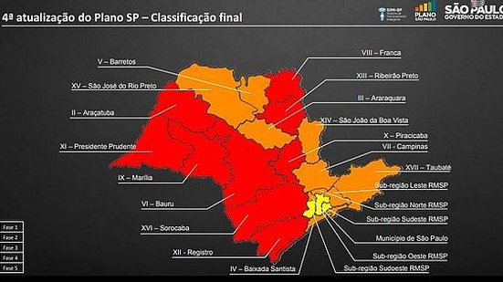 A maior parte do estado, entretanto, retorna ou permanece na fase vermelha, a mais restritiva. A secretária de Desenvolvimento Econômico, Patrícia Ellen, defendeu que tal cenário está de acordo com as projeções feitas pela gestão estadual.