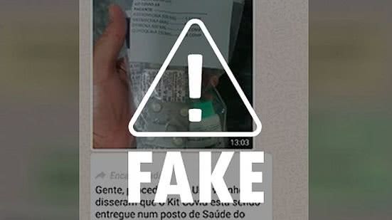 A imagem compartilhada mostra uma embalagem com vários remédios e no rótulo traz escrito os nomes de alguns medicamentos: azitromicina, ivermectina, dipirona e cloroquina. Anexado à foto há o seguinte texto: “Gente, procede isso? Uns vizinhos disseram que o Kit Covid está sendo entregue num posto de saúde do Medeiros Neto”.