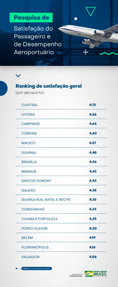 Dados da “Pesquisa de Satisfação do Passageiro e de Desempenho Aeroportuário”, realizada pelo Ministério da Infraestrutura, por meio da Secretaria Nacional de Aviação Civil, indicam que, pela primeira vez, desde o início da série histórica, em 2013, todos os principais aeroportos do Brasil registraram notas médias acima de 4 (bom), superando a meta estipulada pela Comissão Nacional de Autoridades Aeroportuárias (Conaero). Em uma escala de 1 a 5, onde 1 significa “muito ruim” e 5 “muito bom”, a média do indicador de satisfação geral do passageiro ficou em 4,39.