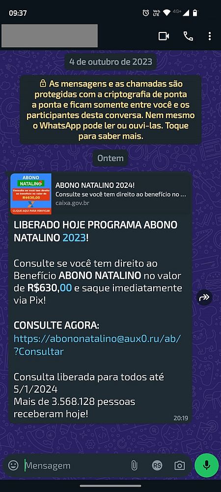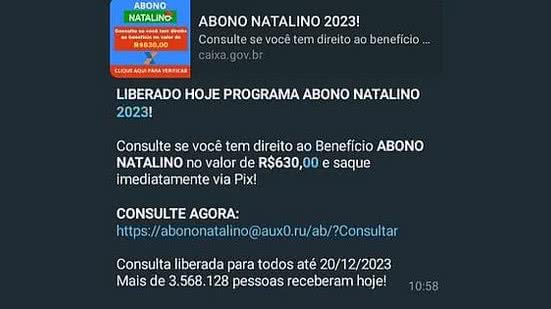 Governo Federal não está realizando Programa Abono Natalino. Golpistas estão enviando mensagens com link citando a ação fictícia. Esse link leva a um endereço que oferece risco a usuários.