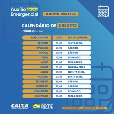 Calendário- As parcelas extras do Auxílio Emergencial 2021 começarão a ser pagas no dia 20 de agosto para os brasileiros nascidos em janeiro e os demais beneficiários receberão conforme abaixo: