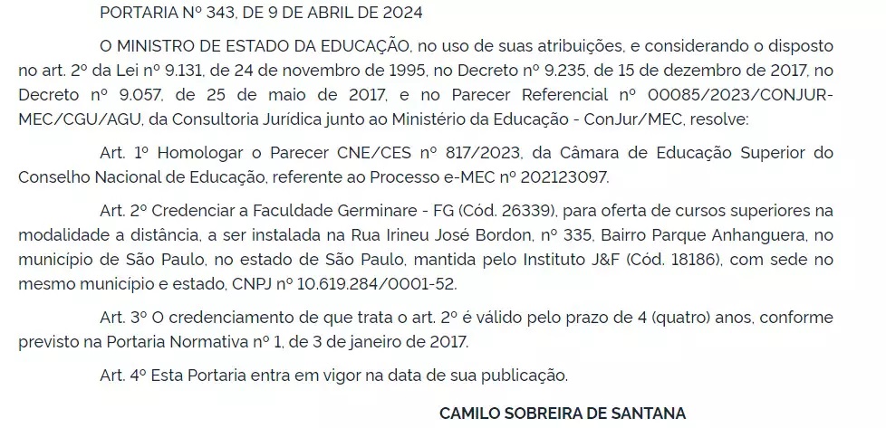 A portaria, assinada pelo ministro Camilo Santana, foi publicada em 9 de abril no Diário Oficial da União.