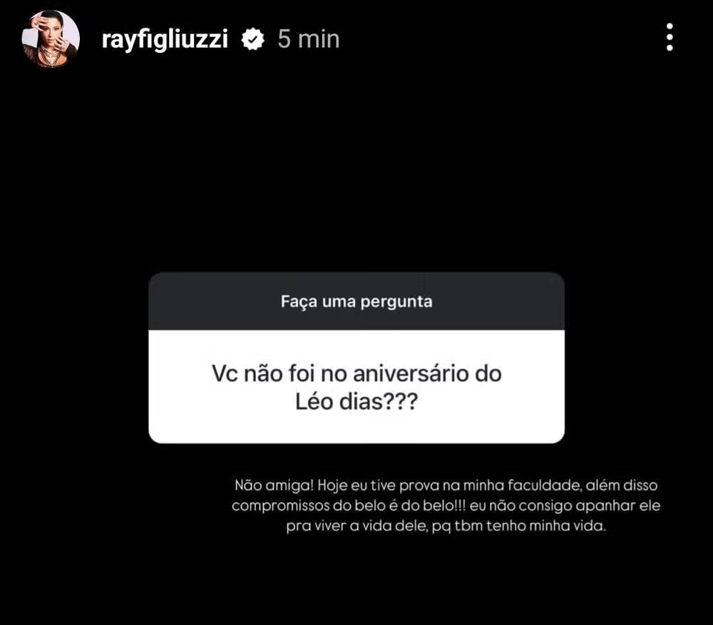 "Não [fui], amiga! Hoje eu tive prova na minha faculdade, além disso, compromissos do Belo são do Belo!!! Eu não consigo acompanhar ele pra viver a vida dele, porque também tenho minha vida", respondeu Rayane.