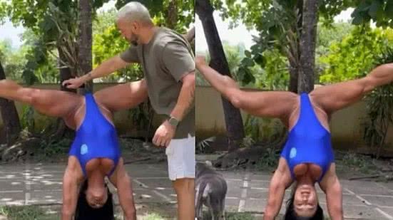 Flexibilidade - A influenciadora fitness mostrou toda sua flexibilidade e equilíbrio ao plantar bananeira perto de uma árvore. No Instagram, ela aparece esticando e abrindo as pernas ao máximo.