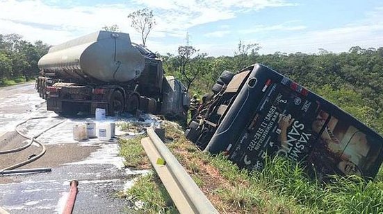 Um acidente envolvendo um caminhão tanque, carregado com óleo diesel, e um ônibus particular, no km 77, da Rodovia 040, entre Cristalina e Luziânia, em Goiás, por volta das 8h40 deste sábado (22), deixou uma pessoa morta e cinco feridas.