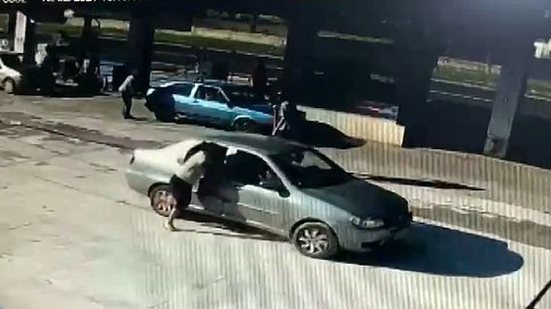 Imagens da câmera de segurança do posto de combustíveis onde a situação aconteceu mostram a mulher presa ao carro correndo do lado do veículo.