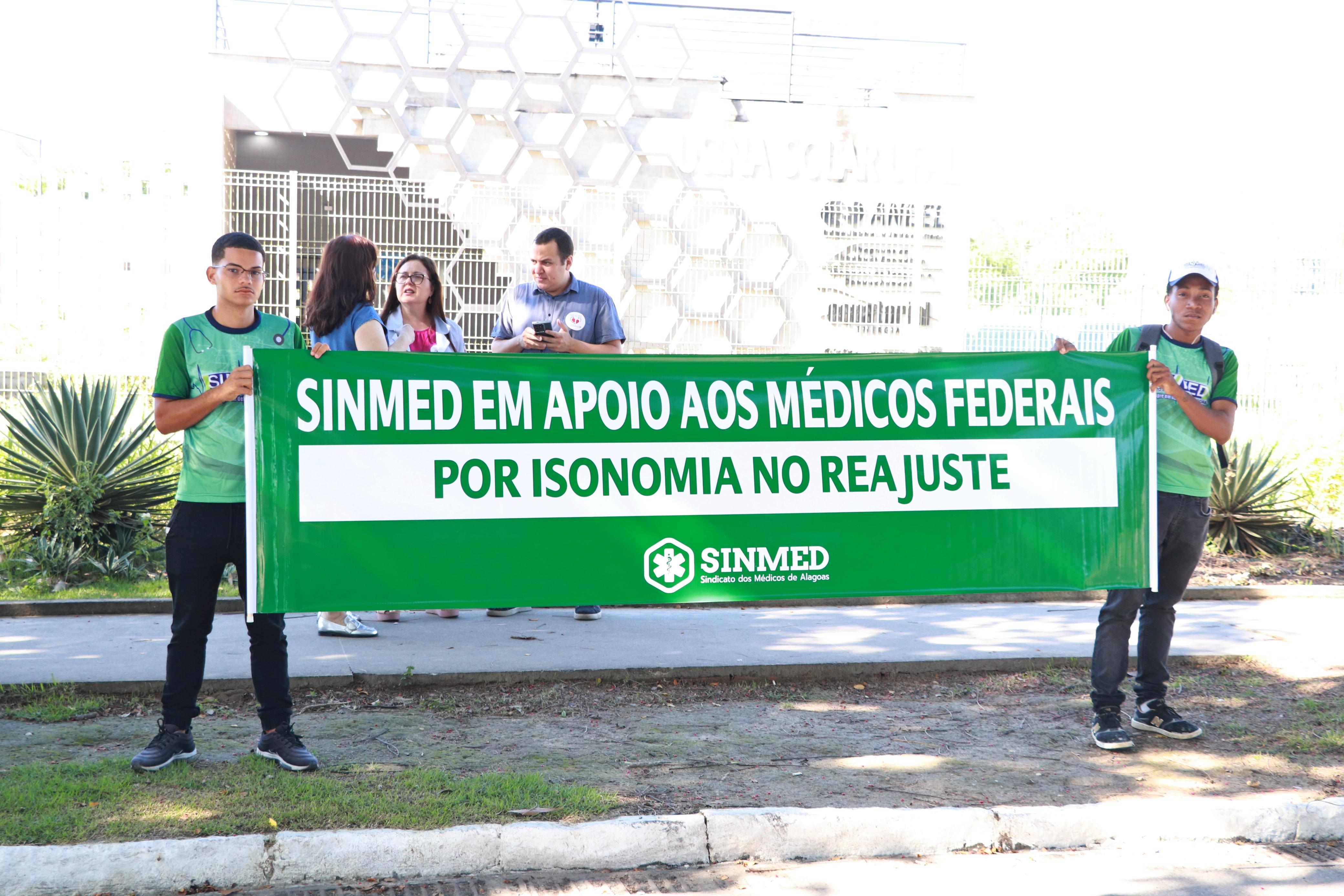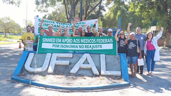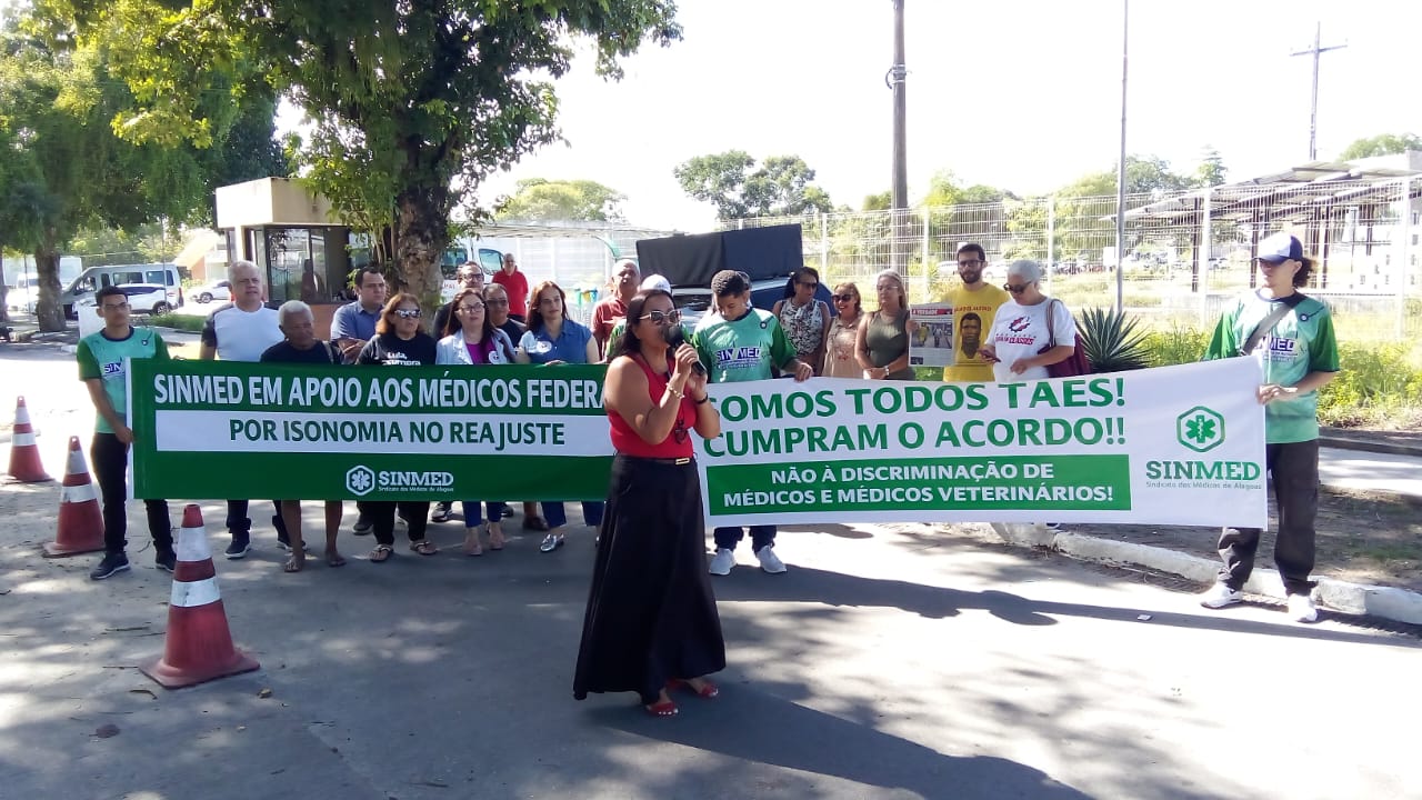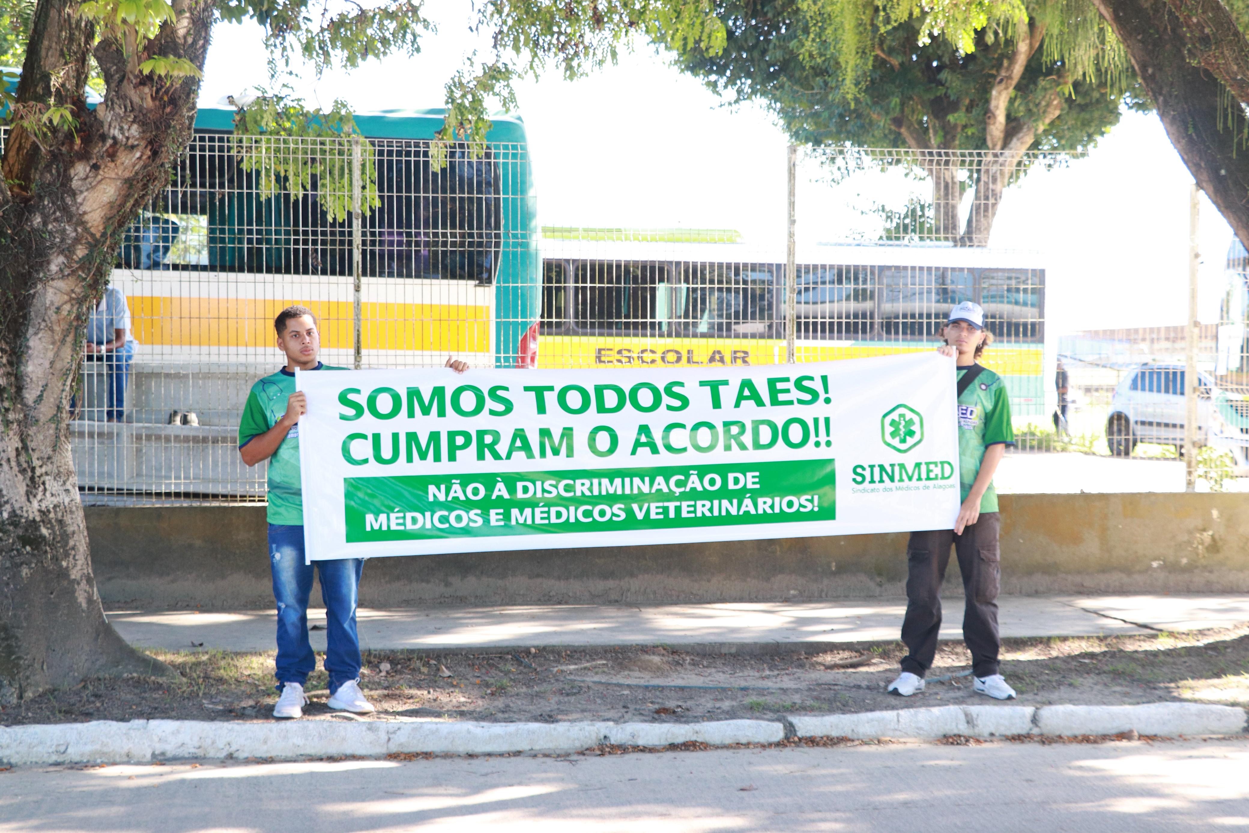 Um grupo de médicos e de médicos veterinários, lotados em instituições federais de ensino, realizou um protesto na manhã desta quinta-feira, 12, na entrada da Universidade Federal de Alagoas (Ufal), em Maceió, para pedir o cumprimento do acordo de greve assinado com o Governo Federal, relacionado ao Projeto de Lei (PL) 1466/2025.