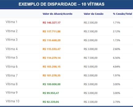 Já por meio da BrasilMais Precatórios, com sede em Fortaleza/CE, foram liberados valores ainda mais alarmantes: de R$ 5.106.773,12 liberados pela Justiça as vítimas receberam somente R$ 503.750,00, resultando em uma taxa de pagamento de apenas 9,86% do valor devido, uma apropriação de R$ 4.603.023,12.