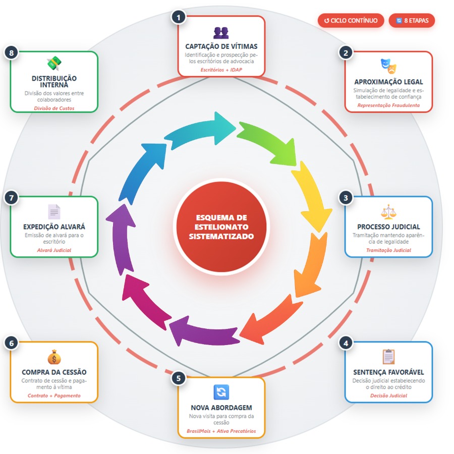 A investigação, iniciada há quase um ano a partir de denúncias que apontavam a exploração financeira de vítimas por meio de cessões de crédito judicial, revelou um esquema sofisticado e coordenado que operava através de múltiplas estratégias predatórias.