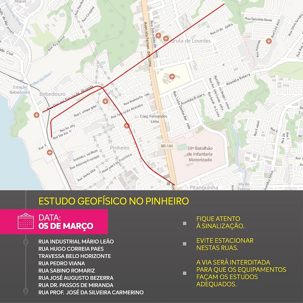 Começou no último sábado (02), estudo sísmico no bairro do Pinheiro e em ruas de bairros próximos, incluindo Gruta de Lourdes, passando pelas imediações da Avenida Rotary, que se estenderá até o dia 12 de março. Nesta terça feira, algumas ruas precisarão ser parcialmente interditadas e em um dos lados das vias não poderá ter carros estacionados.
