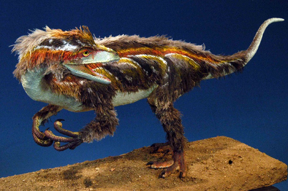 O Pampadromaeus barberenai é reproduzido acima, com penas e 1,2 m de altura. — Foto: Gabriel de Mello / Ulbra / Divulgação