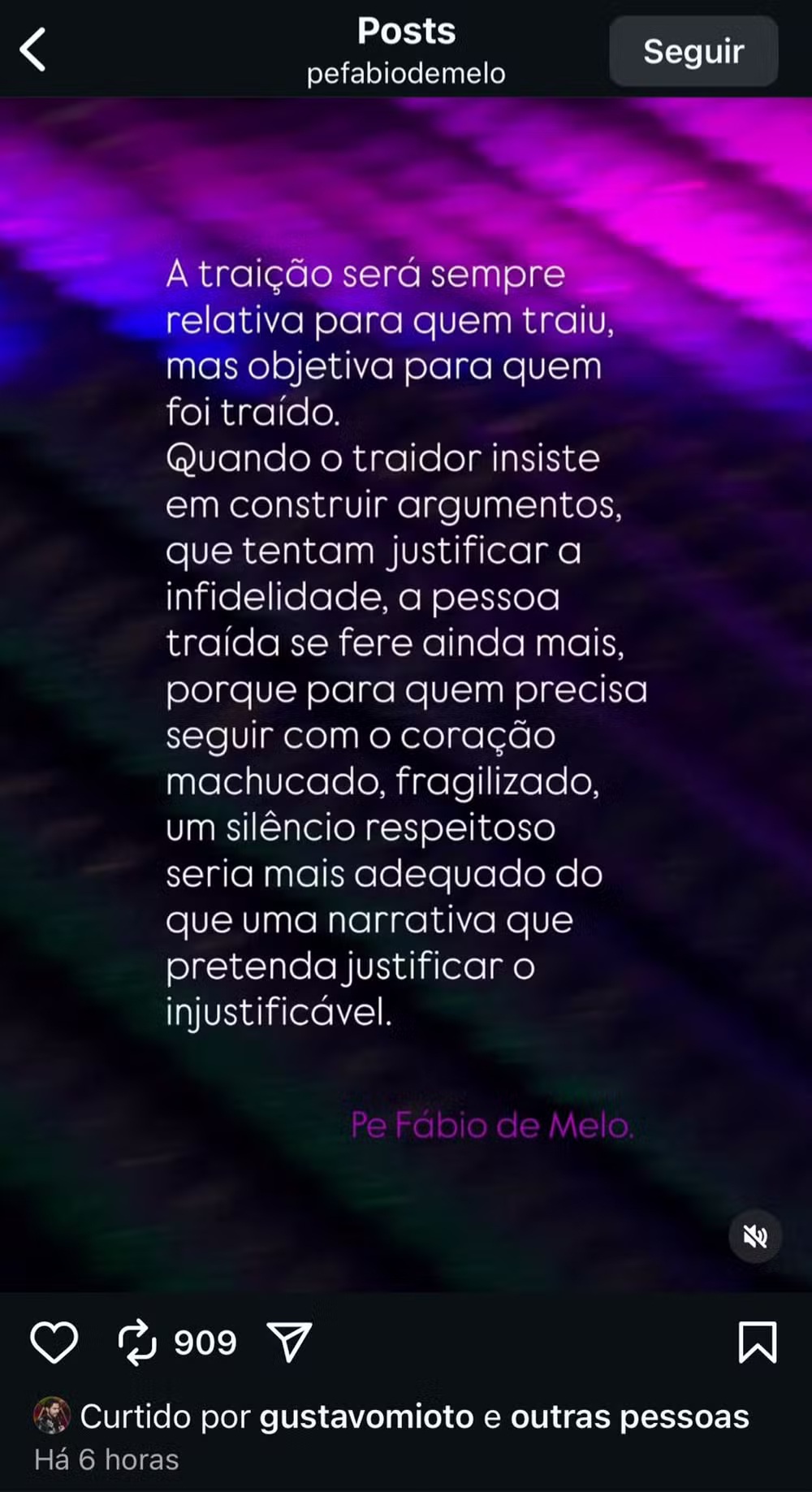 "A traição será sempre relativa para quem traiu, mas objetiva para quem foi traído. Quando o traidor insiste em construir argumentos que tentam justificar a infidelidade, a pessoa traída se fere ainda mais, porque, para quem precisa seguir com o coração machucado e fragilizado, um silêncio respeitoso seria mais adequado do que uma narrativa que pretenda justificar o injustificável", diz a mensagem que recebeu like de Mioto.