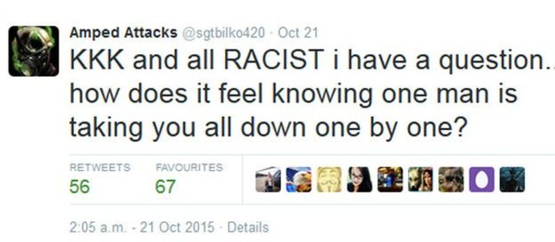 "KKK e todos os racistas tenho uma questão. como é saber que um homem está derrubando todos vocês um por un?", disse o hacker em sua conta no TwitterReprodução/BBC Brasil