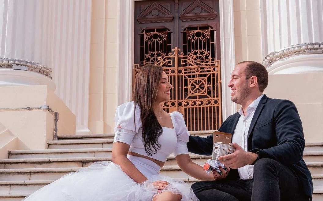 Na foto do Instagram o casal, Rafael Falcão e Agtha Fontan faz juras de amor na vida e com o hambúrguer