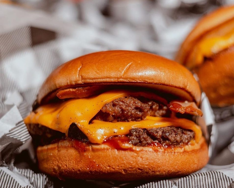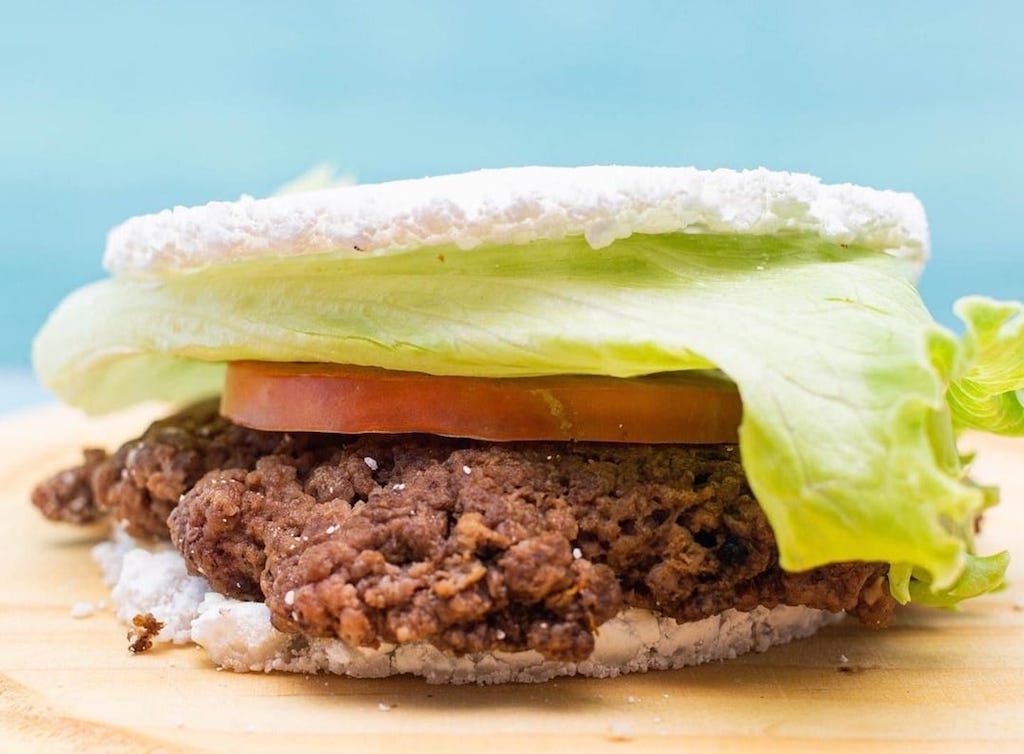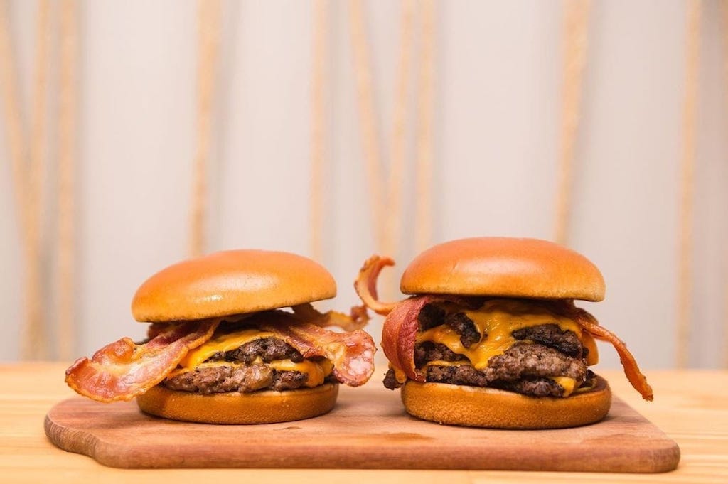 As bolas de carne são prensadas na chapa e recebem queijo, alface, picles de pepino, cebola picada….