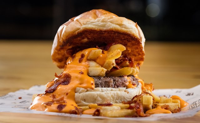 Exagerado – “Deep Trouble” é premiado com generosa porção de queijo cheddar, bacon e batatas fritas. Indicado para quem ama hambúrguer avantajado.