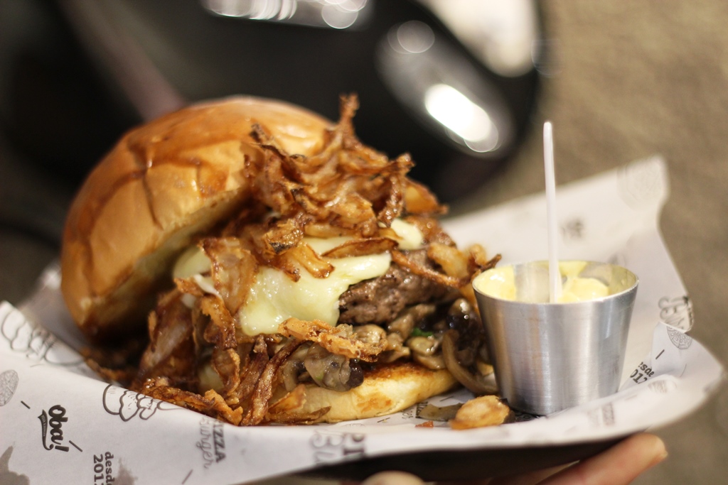 Diferente – O hambúrguer “Oba! Classic” tem suculência, vem com queijo cheddar, bacon crocante, e a grande vedete é a cebola caramelizada que, na realidade, tem textura de geleia. O agridoce ficou bem com o sal da carne. O molho barbecue é da casa e vem separado (ótima ideia).