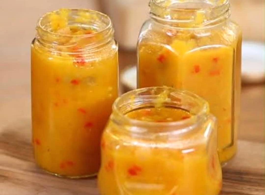 Um dos molhos: Chutney de manga com uma pitada de pimenta dedo de moça e gengibre