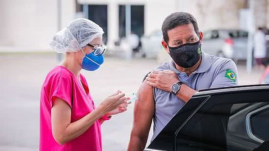O vice-presidente Hamilton Mourão, de 67 anos, tomou nesta segunda-feira (26) a segunda dose da vacina CoronaVac contra covid-19, em Brasília. Ele foi atendido em um dos pontos de vacinação drive-thru da capital.