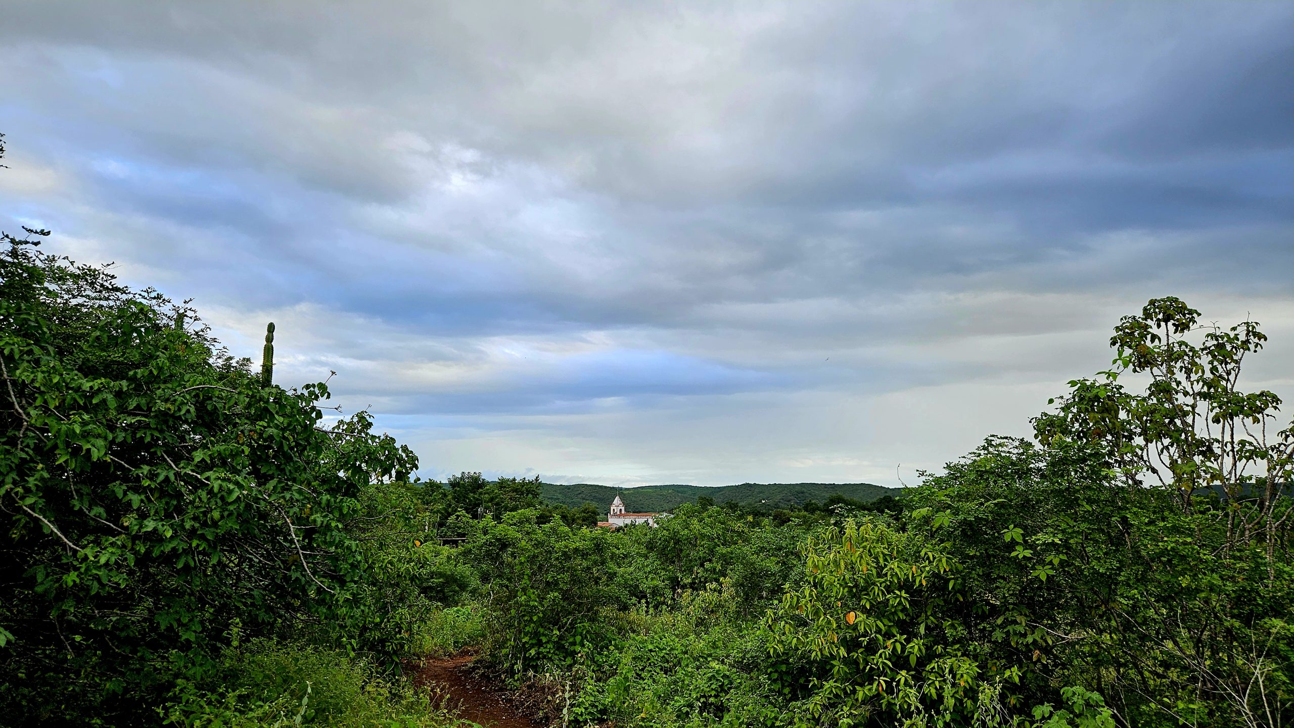 Da trilha da Cachoeira tem a mais bela visão da vegetação da caatinga e da torre da igreja da Ilha do Ferro