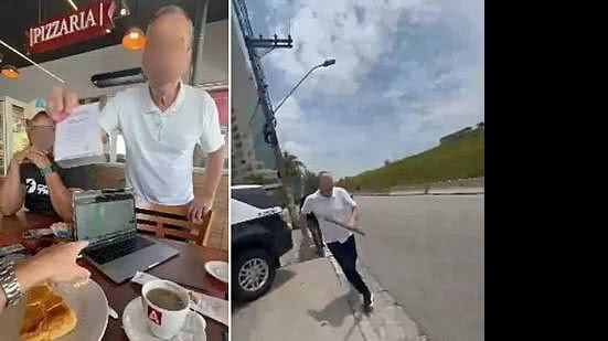Um homem foi filmado ameaçando de morte clientes de uma padaria em Barueri, na Grande São Paulo, após uma discussão por causa de um notebook. Ele estava com um pedaço de madeira.