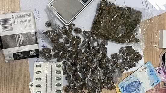 Durante a abordagem feita por uma guarnição do 5º Batalhão da Polícia Militar (5º BPM), foram encontradas 130g de maconha, 25 comprimidos de rohypnol, dinheiro (R$ 32,00) e uma balança de precisão.