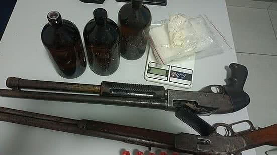 Durante buscas, encontrou-se uma pessoa com as mesmas características e, durante abordagem, o suspeito admitiu estar envolvido com o tráfico e com ele foram apreendidos aproximadamente 680 gramas de cocaína, três litros de loló, duas espingardas calibre 12, dinheiro, uma carteira, uma balança de precisão, e munição de calibre 12.