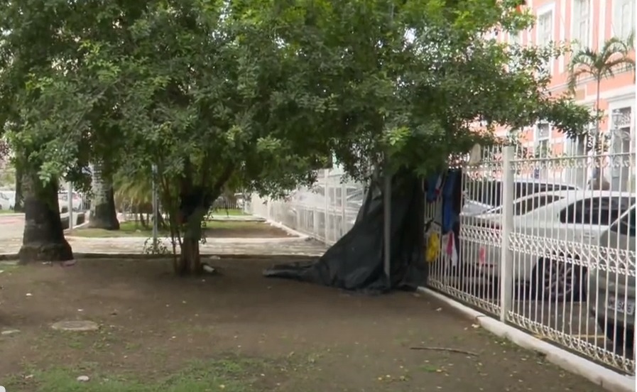 | Moradora em situação de rua estava embaixo desta árvore no momento em que os disparos começaram. Foto: Reprodução/TV Pajuçara |
