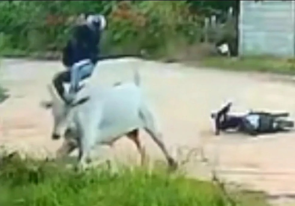 Vídeo registrado por uma câmera de segurança mostra o homem se aproximando do boi, de moto, e freando para esperar o animal se afastar. Entretanto, o boi entende isso como uma afronta e avança.