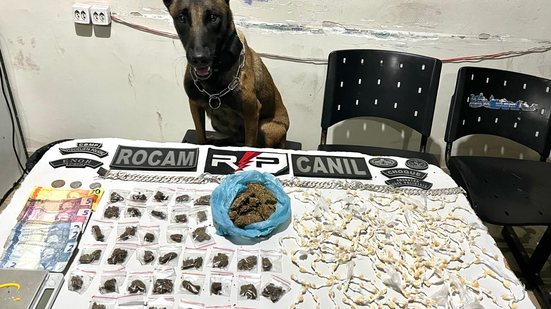 Durantes as buscas, uma cadela farejadora da PM localizou uma grande quantidade de drogas na residência do suspeito. Ele informou que a droga teria como destino um ponto diferente de venda.